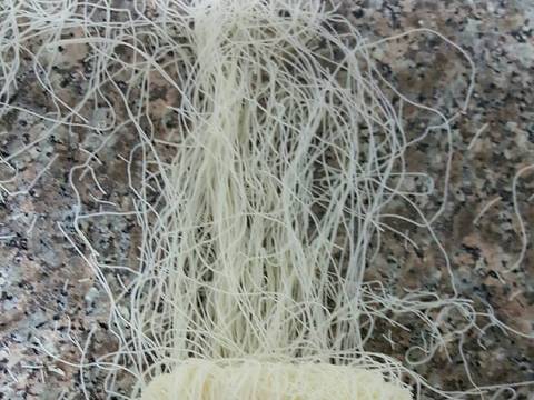- ناخذ بضع من شعيرات الكنافة ونضع عليها قليل من السمنة او ممكن الاستغناء. تؤخذ هذة الكمية 👇👇👇